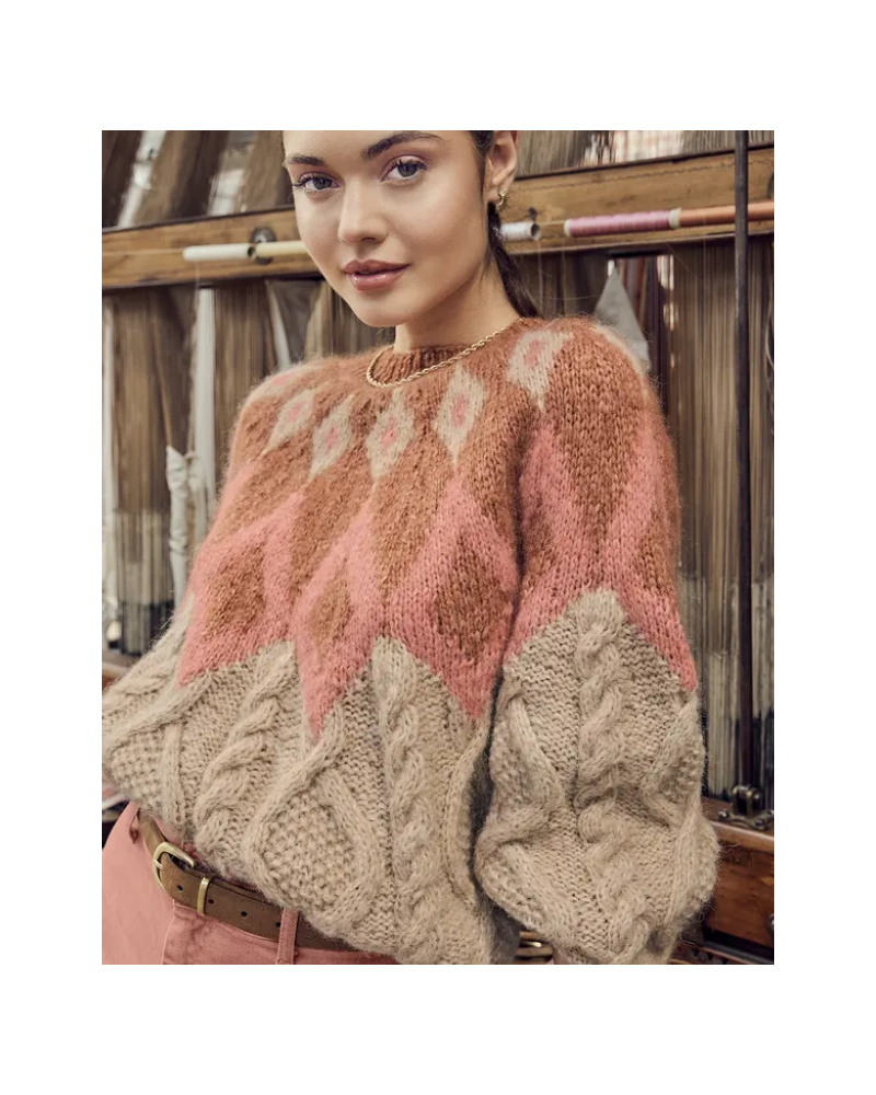 Créativité au sommet ! Vos aiguilles circulaires vont se régaler avec les torsades, les motifs jacquard et les points fantaisie sur ce modèle de pull graphique et fantaisie à tricoter en une seule pièce de bas en haut dans le fil soufflé aspect chiné avec laine précieuse majorité Alpaga douce et chaude PHIL GIVRE, coloris naturel, praline, sorbet. Pour la réalisation de ce modèle vous aurez besoin de : aig. n°4.5, aig. n°5.5, aig. n°6, 1 aig. à torsade, 1 aig. à laine.