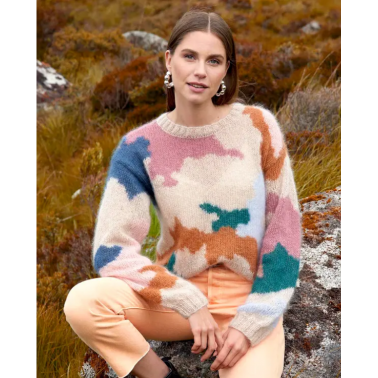 Tendance camouflage, aux allures arty. Vos aiguilles ne vont pas faire tache mais vont plutôt s’amuser à les créer avec les motifs jacquard multicolores sur ce modèle de pull à tricoter dans le fil haut de gamme avec kidmohair, soie et touche de lurex PHIL MOHAIR SOIE LUREX, coloris gazelle, vieux-rose, noisette, canard, saphir, rosée ; et le fil précieux vaporeux et soyeux en mohair et soie PHIL MOHAIR SOIE, coloris noisette.