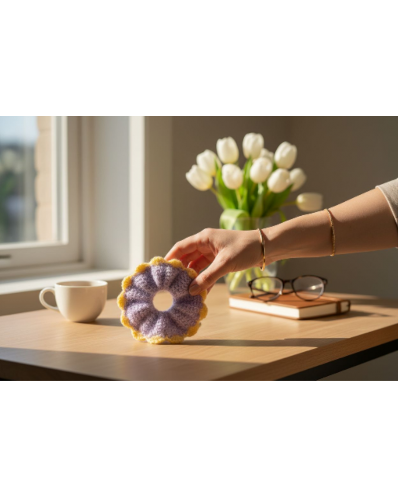Un chouchou d’exception, tricoté main en mohair français pour sublimer chaque coiffure.