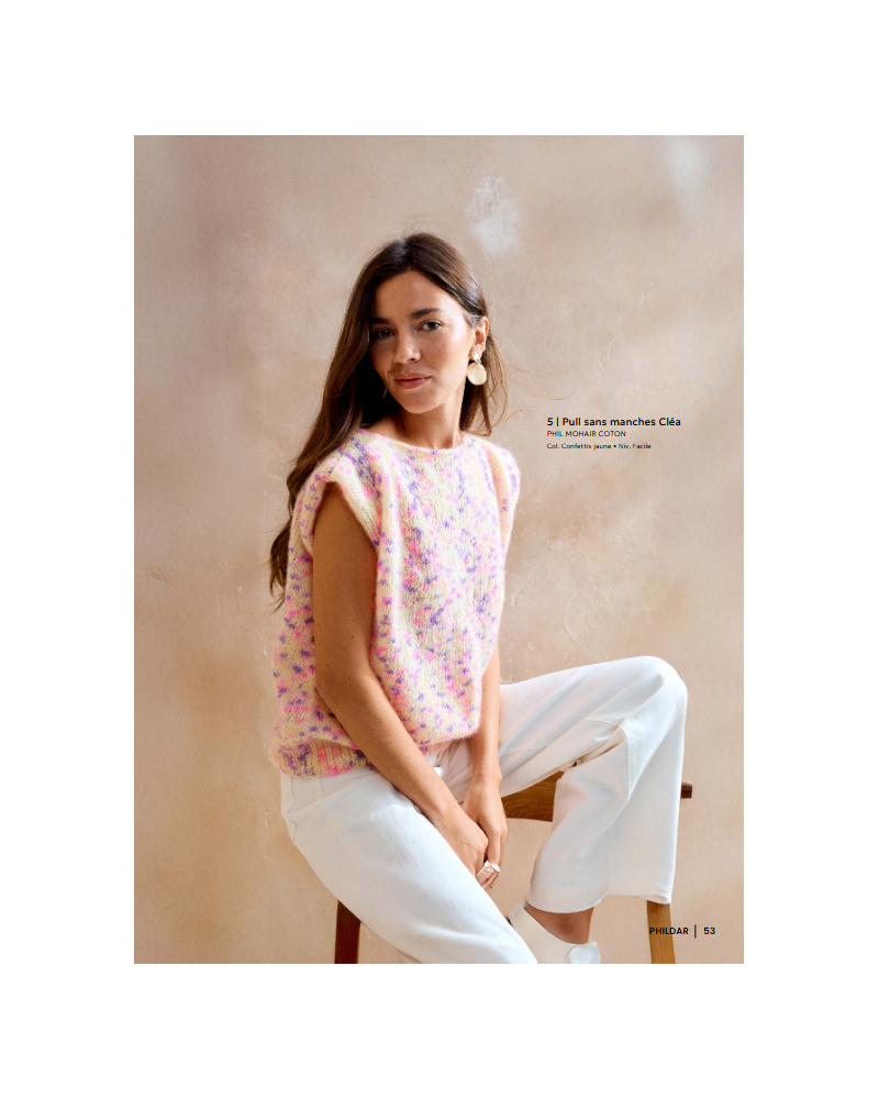 Facile à associer, ce pull sans manches CLÉA se tricote en P. MOHAIR COTON.